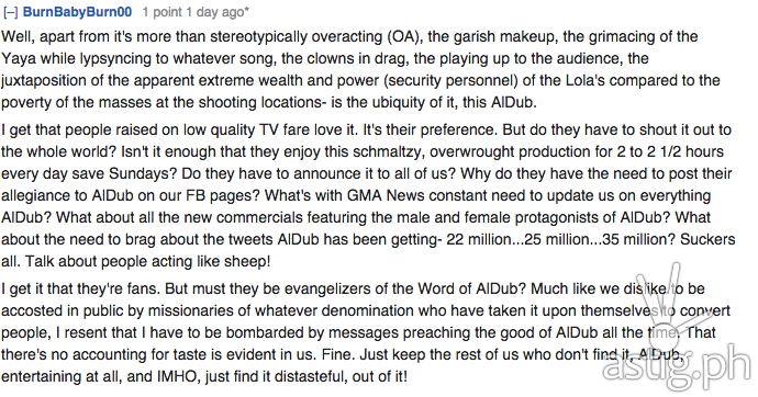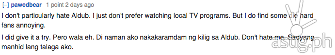 But no matter how massive the fandom of AlDub Nation is, there are still people who hate/dislike and literally don’t buy them. In a reddit thread we have found, netizens express the reasons why they don’t care about the perennial twitter trending topic. The top ten reasons were compiled by ASTIG.PH.