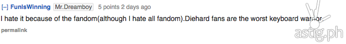 I hate it because of the fandom(although I hate all fandom).Diehard fans are the worst keyboard warrior.