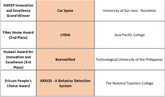Judges narrowed down the competition to the following 10 solutions: LYNIA by Asia Pacific College, ALERTO by Bicol University – Polangui Campus, MOSFAS by Camarines Sur Polytechnic Colleges, Palaymo by Mapua University, ARGOS by National Teachers College, BeeNotified and Smart FDAS by Technological University of the Philippines, Car Space by University of San Jose – Recoletos, iFarm by the University of the Cordilleras, and PONDORA by University of the Immaculate Conception.