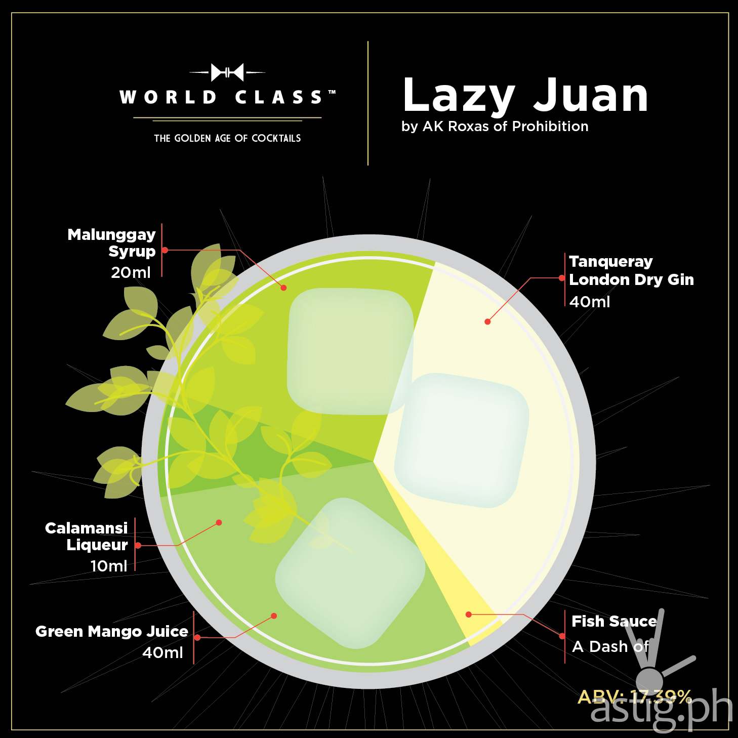 Lazy Juan (2)With a color that represents the abundant natural resources of the Philippine Islands, the Lazy Juan makes use of identifiably Pinoy flavors found in green mangoes and malunggay. A sour drink that is designed to bring to mind the Filipino merienda time, the Lazy Juan is perfect for kicking back and relaxing whether at sundown or sunset.