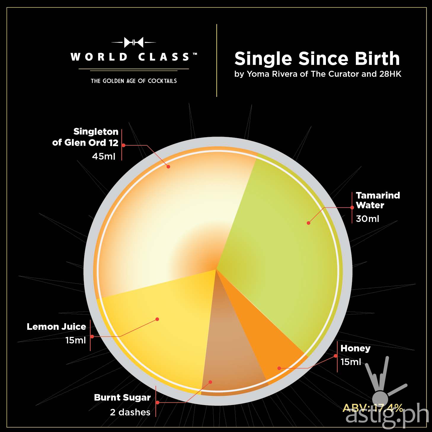 Single Since Birth (2)Inspired by fond memories of his youth, Yoma Rivera created this whisky-based cocktail served in an ice bag with a straw to recreate the experience of playing outside sari-sari stores near his home. Reminiscent of how soft drinks were served to him during his younger years, the Single Since Birth interprets sari-sari culture creating a complex drink made with local ingredients that delivers a smooth, burnt finish.
