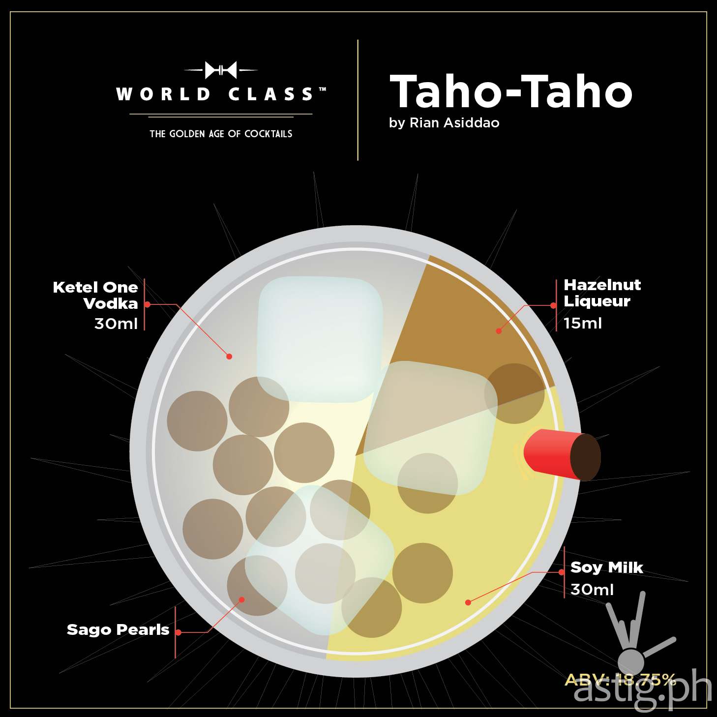 Taho Taho (2)Inspired by the popular taho breakfast culture of the Philippines, this cocktail could also be considered the country’s equivalent of the classic White Russian. Made with a touch of hazelnut for sweetness and sago pearls for that unique taho texture, this cocktail lifts from Filipino street culture favorites and combines them with premium ingredients to recreate a culinary experience familiar to any Pinoy.