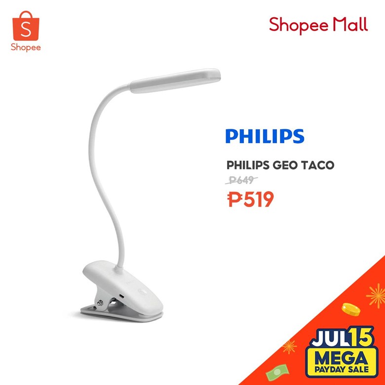 Working late? Illuminate your workspace with Philips Geo Taco. It features an anti-sliding rubber under the clamp, a silent gooseneck for a quiet and smooth light redirection experience, three dimming levels, and a built-in lithium battery which can last up to 15 hours.