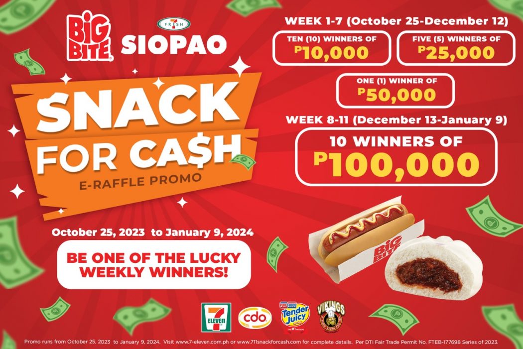 PHILIPPINES – 7-Eleven, everyone’s favorite convenience store, is excited to introduce its Snack for Cash E-Raffle Promo featuring two of its famous treats: the Big Bite Hotdog and the 7-Fresh Siopao, with a glowing chance to win big time cash prizes weekly.