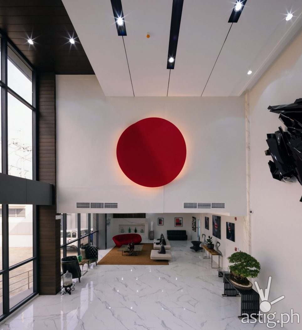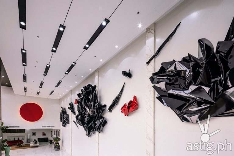 Providing a stark contrast to the serene white space that it occupies, Jinggoy’s sculpture Okurimono, features dramatic distortions reminiscent of crumpled pieces of paper in arresting shades of black and red. A single and striking large red circle sits alone on the opposite wall. Lovingly named Red Moon by the artist, the piece is a silent and steady witness to the dynamism of Okurimono.
