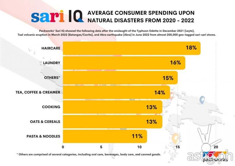 However, it was revealed that there was a 50% to 60% increase in food spending, specifically noodles and cooking essentials, after Typhoon Odette hit Leyte compared to the past 7 days of normal weather conditions. In fact, hair care products trailed behind at 11% in average consumer spending, following pasta and noodles at 15%.