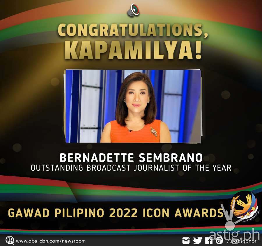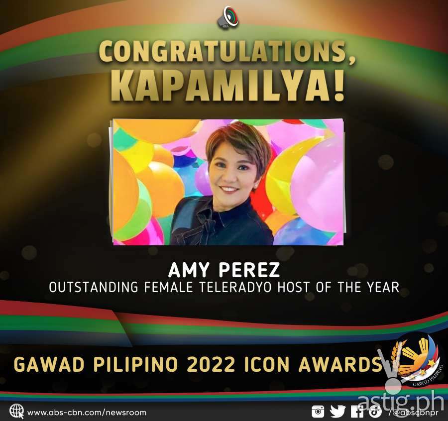Meanwhile, ABS-CBN News personalities took home awards including Noli de Castro (Outstanding News and Public Affairs TeleRadyo Host of the Year), Amy Perez (Outstanding Female TeleRadyo Host of the Year), Alvin Elchico (Most Outstanding Male News Presenter of The Year), and Bernadette Sembrano (Outstanding Broadcast Journalist of The Year).