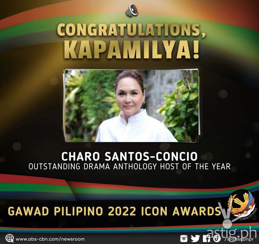 Award-winning actress and host Charo Santos-Concio was hailed as the Outstanding Drama Anthology Host of The Year for “Maalaala Mo Kaya,” the longest-running television drama anthology in the Philippines.