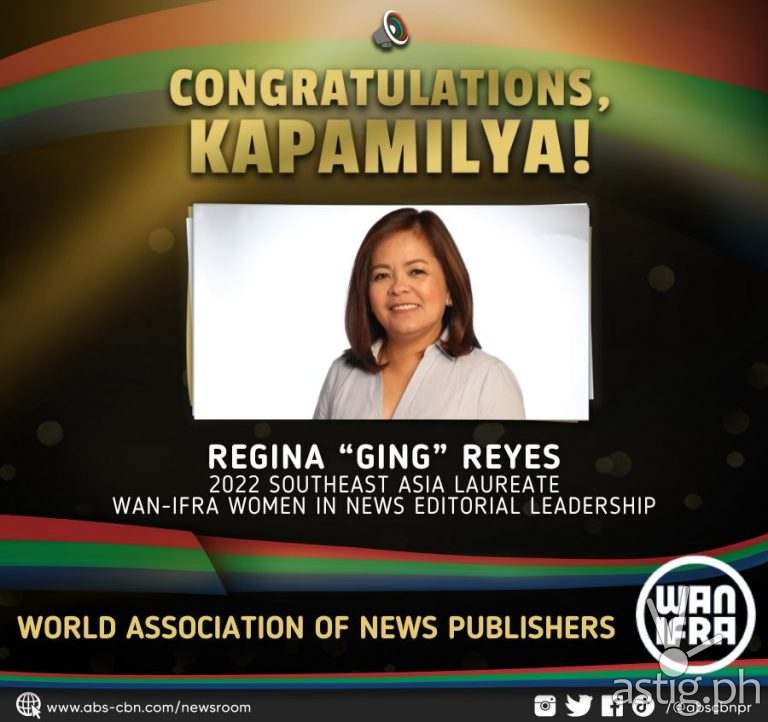 MANILA, Philippines – ABS-CBN News chief Regina “Ging” Reyes has been recognized for her outstanding work as a news leader by the World Association of News Publishers (WAN-IFRA) during the 2022 World News Media Congress in Zaragoza, Spain.