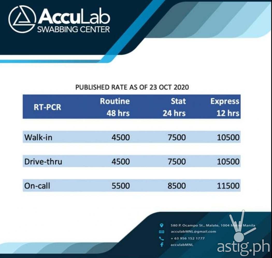 AccuLab MNL’s swab test ranges from 4500 to 11500 depending on the turnaround time for results. AccuLab MNL’s also offers Antigen Rapid Testing at a very low price of P1,400. We accept walk-in, drive-through and remote collection.