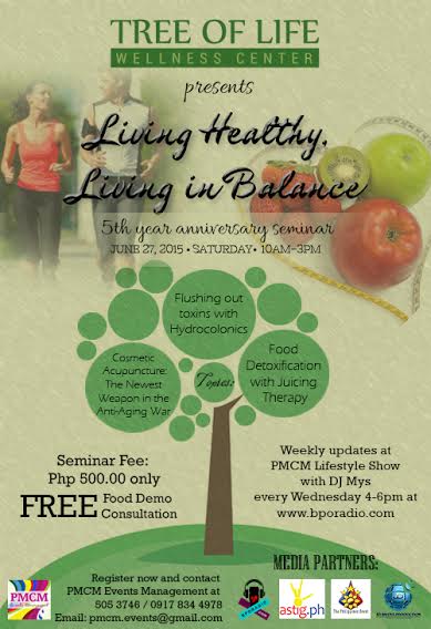 This coming June 27, 2015, Tree of Life Wellness Center invites you to its Living Healthy, Living in Balance 5th year Anniversary Seminar. In this seminar, you will get to know “Hydrocolonics”, Food Detoxification, Juicing Therapy and Cosmetic Acupuncture. They will also answer questions for attendees, make food demonstrations and give free health consultations. This would surely be a fun filled and informative day for everyone.