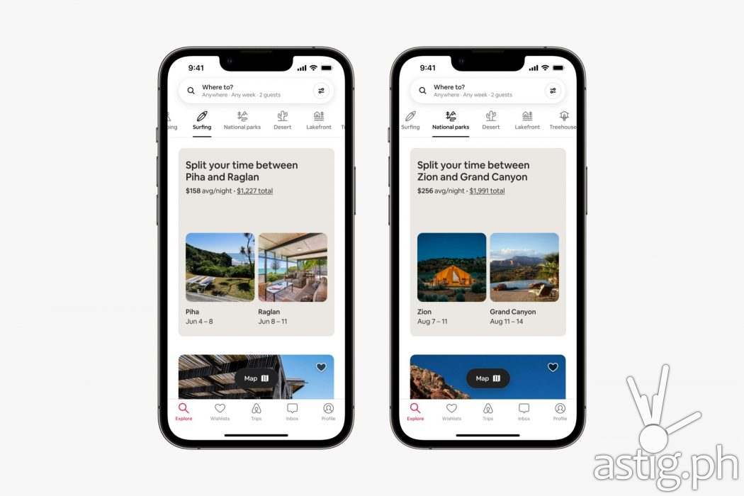 When searching a specific destination, Split Stays automatically appear in your search results. They also appear within 14 categories — including Camping, National Parks, Skiing, and Surfing — to inspire you to stay in two destinations as part of a longer trip.