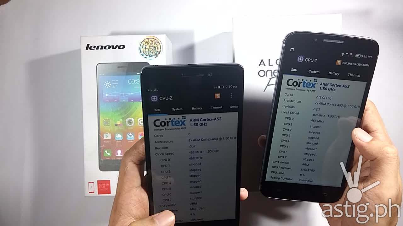 Both devices are supposed to be powered by a 64-bit octa-core ARM Cortex-A53 CPU running at 1.5 GHz, although our Alcatel ONETOUCH Flsh Plus unit only showed 7 cores with 8 CPUs.