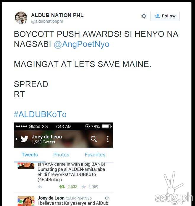 This was immediately reposted by ALDUB fan account ALDUB NATION PHL with the message “BOYCOTT PUSH AWARDS! SI HENYO NA NAGSABI @AngPoetNyo MAGINGAT AT LETS SAVE MAINE.”