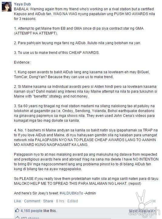 4. No. 1 bashers ni Maine andyan sa kanila so bakit natin siya ipapahamak sa TRAP na to If you love AlDub and Maine, di nyu hahayaan gamitin sila ng kalaban para umangat network nila PALAGPASIN NYO NA TO PLEASE CHEAP AWARDS LANG TO AANHIN MO AWARD KUNG NAGPAGAMIT KA LANG.