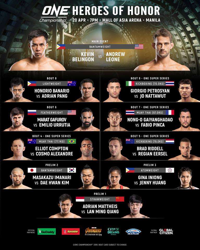 ONE: HEROES OF HONOR goes down this Friday, 20 April at the Mall of Asia Arena in Manila, Philippines. Gates open at 6:30 PM local time.