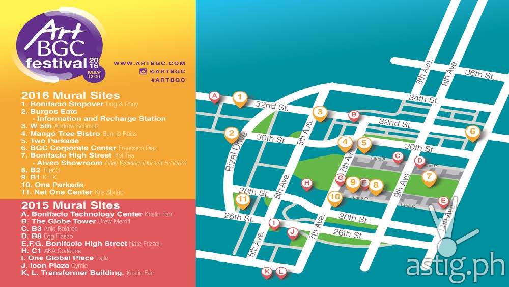 The festival is done in collaboration with LA-based art consultancy LeBasse Projects and Honeycomb Communities. Multi-disciplinary artists such as: PastelFD, Andrew Schoultz, HOTxTEA, Bunnie Reiss, Aleks Kocev and Blaine Suque are bringing in their unique brand of creativity, hoping to build on the iconic atmosphere of BGC. Representing the Philippines in this festival are Kris Abrigo, Trip63 and ArtBGC Open Call winner, FK.