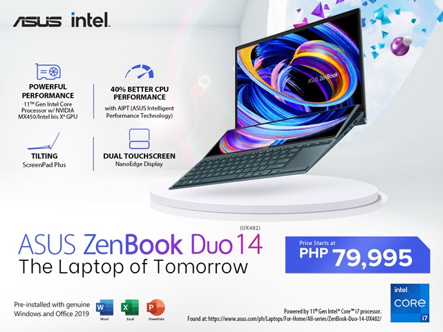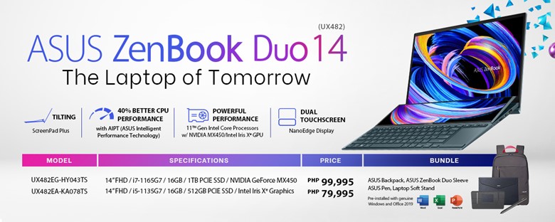 ASUS ZenBook Duo 14, Intel® EVO variant is designed to match the fast-paced lifestyle and helps boost your productivity and multitasking. Powered by 11th Generation Intel® Core™ i5 processor and Intel® Iris® Xe Graphics, 16GB Memory and 512GB SSD storage is priced at P79,995. The ASUS ZenBook Duo 14 will also be available with 11th Generation Intel® Core™ i7 processor and NVIDIA® GeForce® MX450 Graphics, which makes it perfect for light content creation such as photo editing and light video editing and comes with 16GB memory and 1TB SSD priced at P99,995. Both variants also come with out of the box free bundled items.