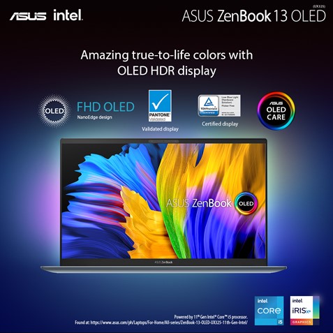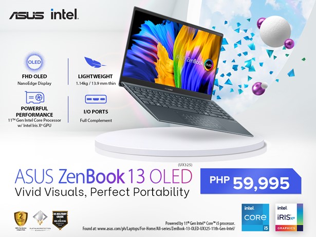 ASUS ZenBook 13 OLED, tagged as the world’s thinnest OLED laptop, is available in Pine Grey color, equipped with the latest 11th Generation Intel® Core™ i5 processor, Intel® Iris® Xe Graphics, with 8GB memory, 512GB SSD storage and exclusive out of the box bundled items is priced at P59,995.