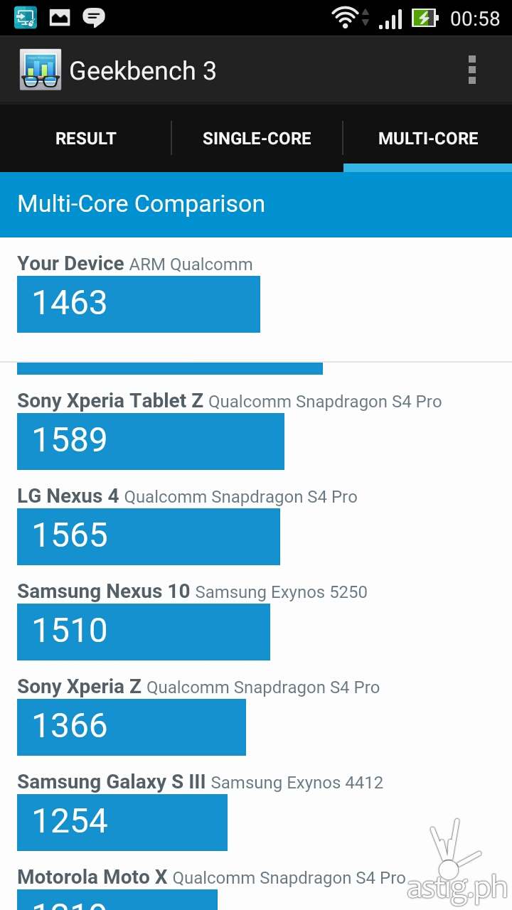 For multi-core operation, the ZE550KL scored 1463 points, placing it above the Sony Xperia Z (1366) but below the Samsung Nexus 10 (1510). By comparison, the Samsung Galaxy S 5 has a score of 2836 points.