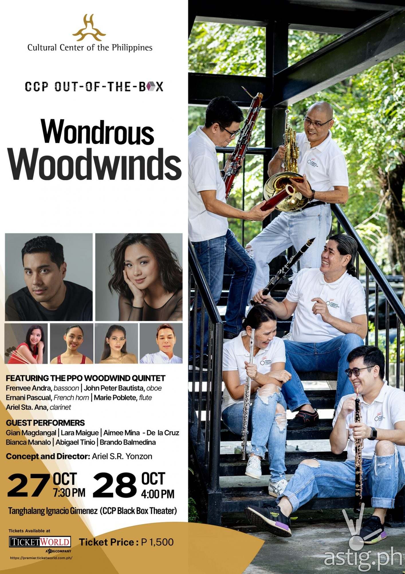 Experience the unique timbres of woodwind instruments in the third installment of the CCP Out-of-the-Box Series (OOTB), featuring the PPO Woodwind Quintet with singers Lara Maigue and Gian Magdangal, on October 27, 7:30pm and October 28, 4pm, at the Tanghalang Ignacio B. Gimenez (CCP Blackbox Theater).