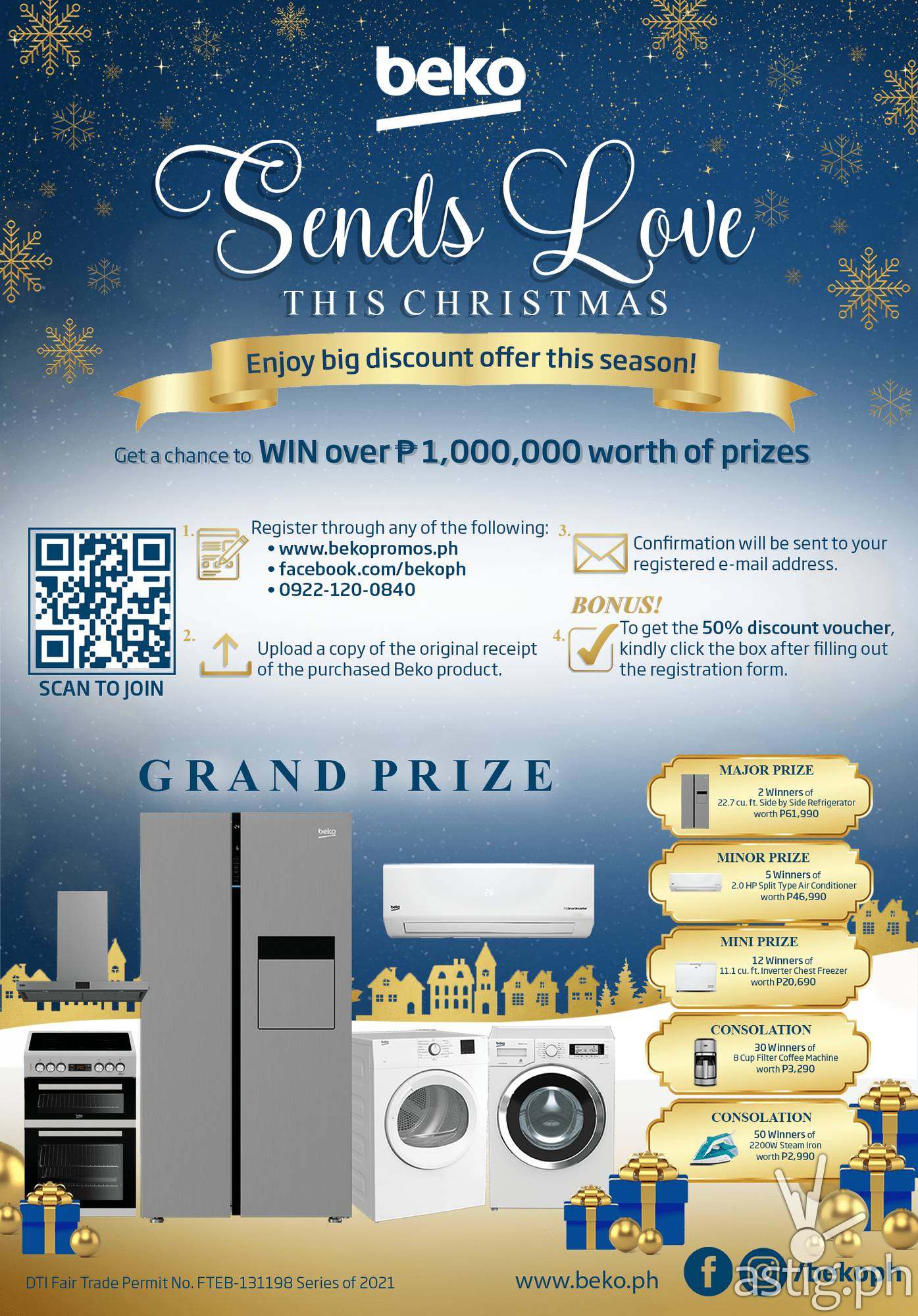 The winners will be announced after the raffle draw on December 17, 2021 at 11am via Zoom with DTI representative. A customer can only win once. Beko Pilipinas Corp. will shoulder the 20% tax for prizes over Php10,000.