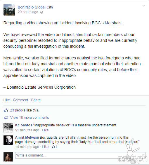 Our marshals are tasked to enforce the rules and maintain peace and order within BGC, and while their actions in this particular incident were not unprovoked, we do not condone the over-aggressive behavior shown by some of them in this incident. We will strive to ensure that BGC marshals always act professionally, lean on the side of restraint, and are able to regain the trust and confidence of everyone who lives, works and visits BGC.