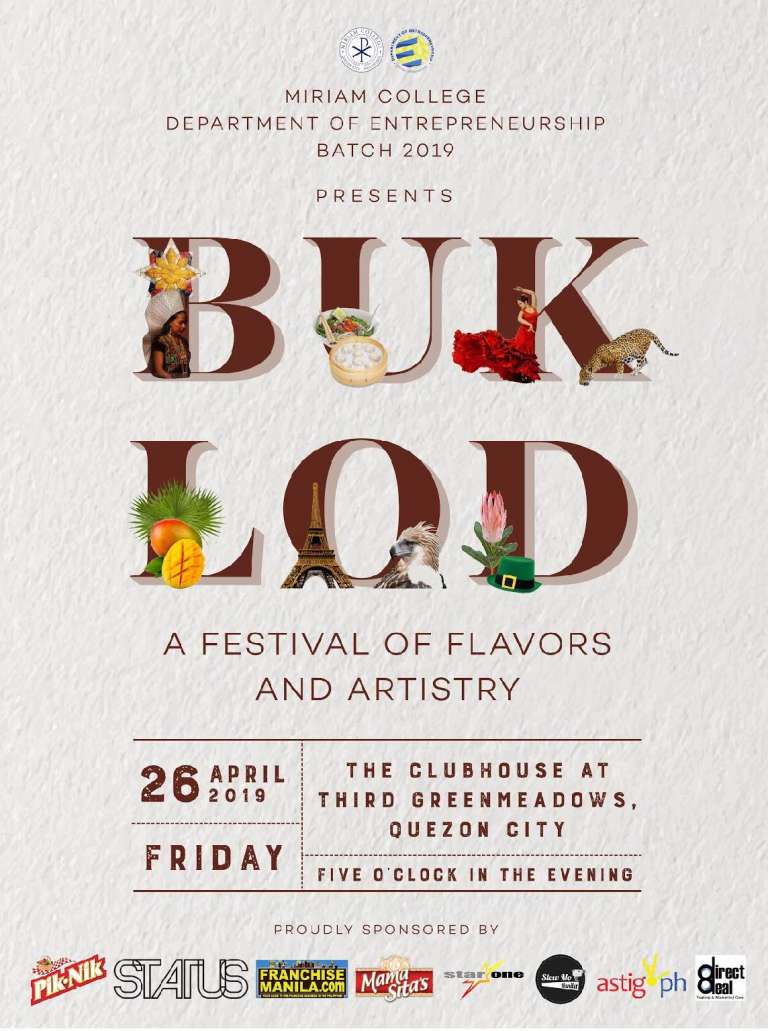 The Society of Junior Entrepreneurs, Miriam College will be holding BUKLOD: A Festival of Flavor and Artistry on April 26, 2019 at The Clubhouse at Third Green Meadows located at 14 Giraffe, Quezon City, Metro Manila.