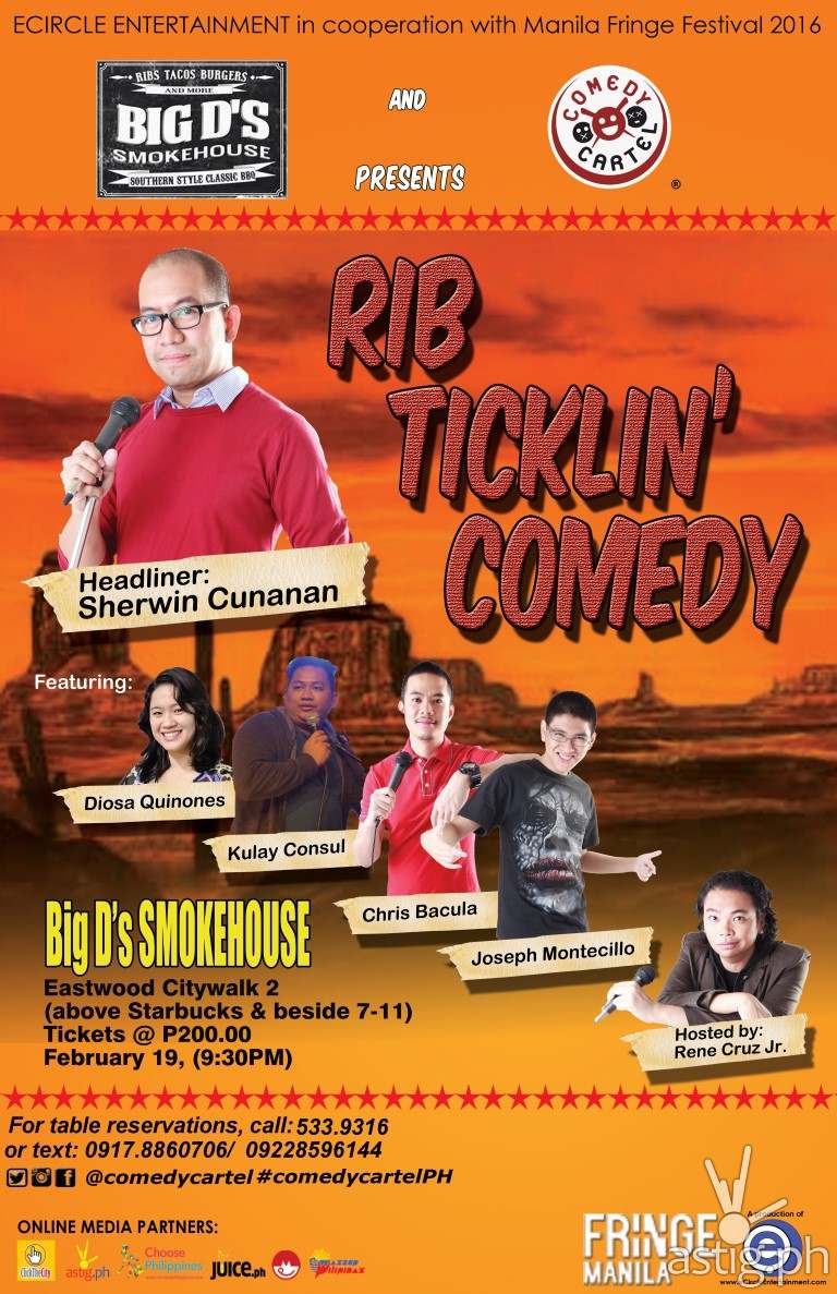 Get ready for a rip-roaring laughter from the Comedy Cartel as they return to Big D’s Smokehouse at Eastwood City’s , City Walk 2 (above Starbucks & beside 711) this Friday February 19, @ 9:30pm.