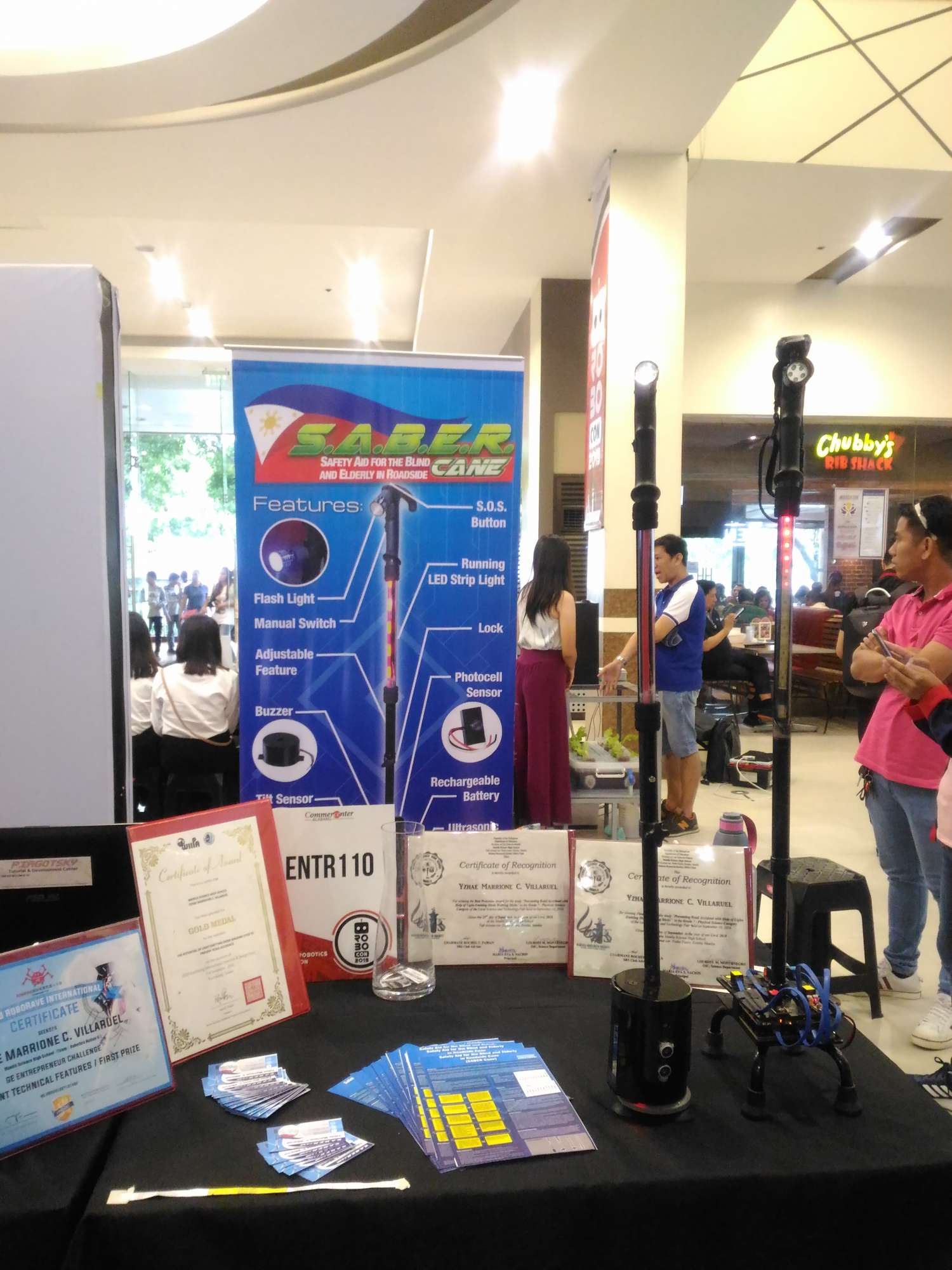 About the invention: SABER is a cane for the visually impaired and senior citizens, with built-in flashlight and sensors that will alert the visually impaired on the impending hazards.