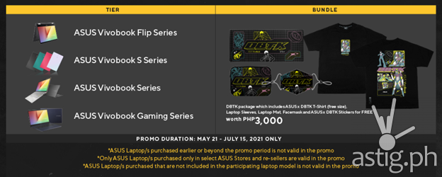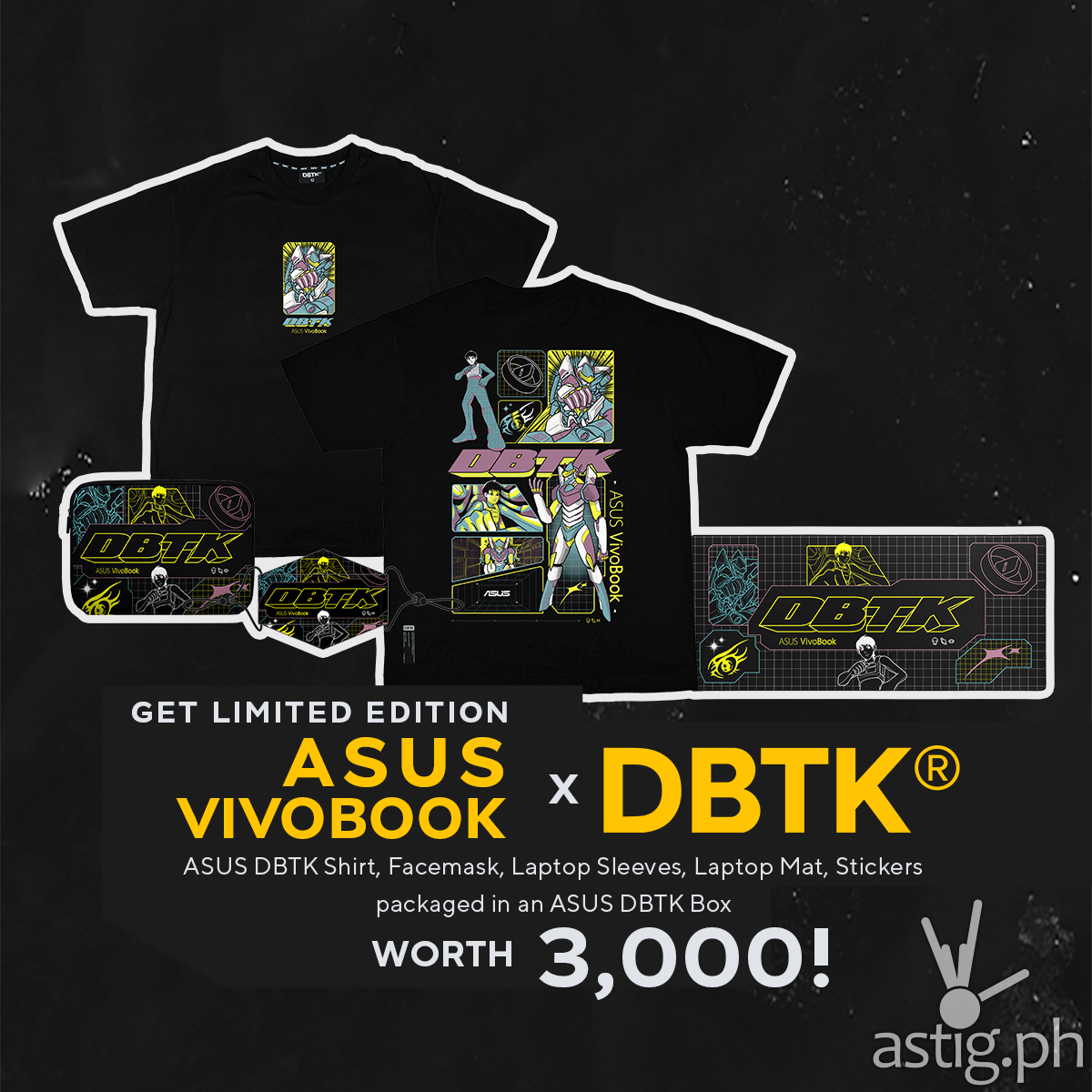PHILIPPINES – ASUS and Don’t Blame The Kids Apparel Co. announces the limited-edition DBTK® merchandise bundle with ASUS Vivobook laptops. Starting today until July 15, 2021, every customer who will purchase select ASUS Vivobook laptops including ASUS Vivobook Flip, ASUS VivoBook S, ASUS Vivobook and ASUS Vivobook Gaming will get free limited edition DBTK® merchandise worth PHP 3,000 which includes a T-Shirt, Laptop Mat, Laptop Sleeve, Facemask and sticker packed in an exclusive ASUS DBTK Box.