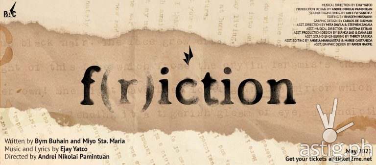 The 2021 production of f(r)iction is under the creative leadership of Director Andrei Pamintuan and Musical Director Ejay Yatco, the same duo behind Sa Wakas, the Sugarfree musical. They are joined by Director of Photography Rhadem Musawah, Sound Engineer Jan Levi Sanchez, and Graphic Designer Carlos De Guzman to refresh this original musical first featured in the iconic Fringe Manila Festival in 2015.