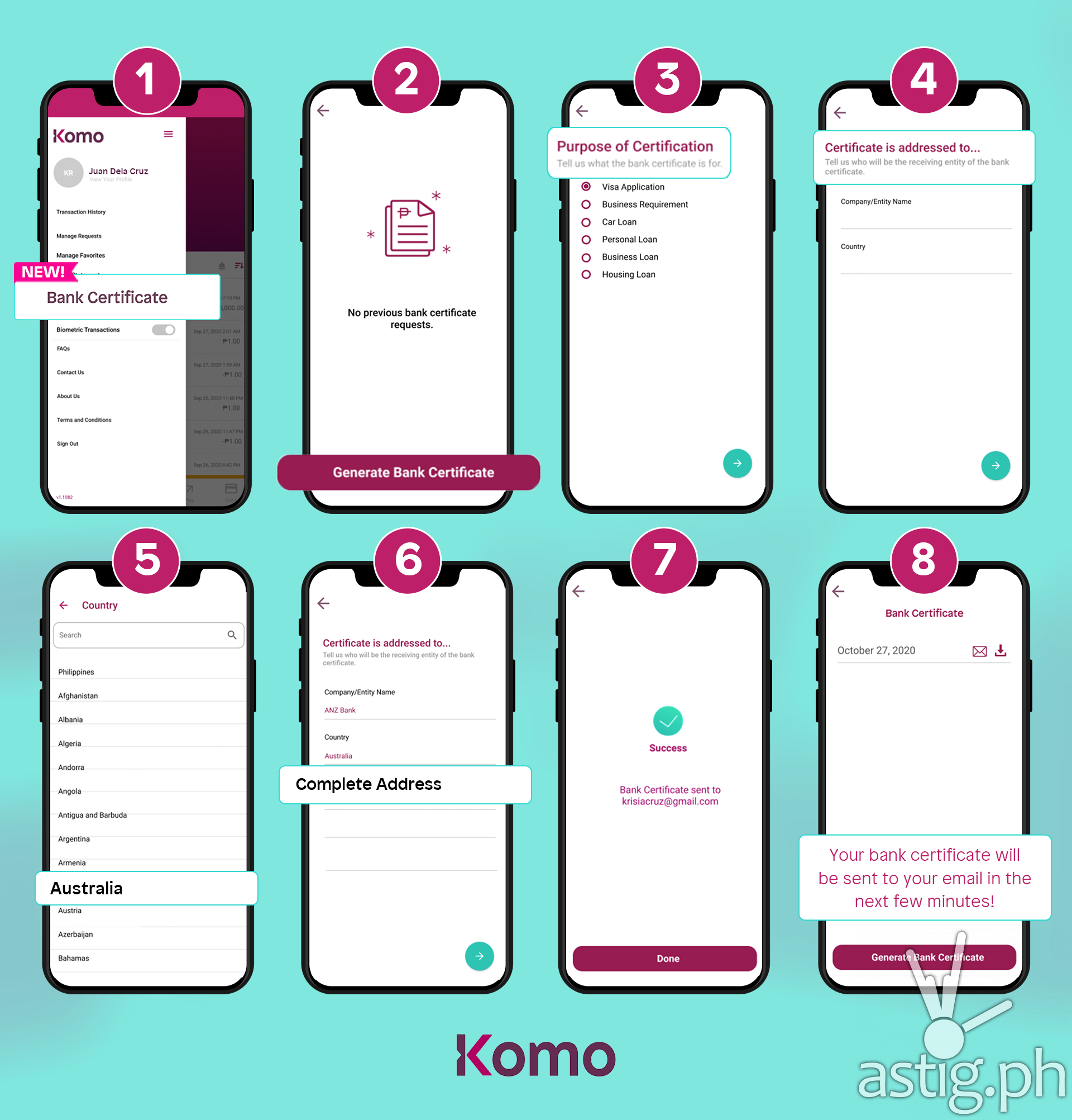 For added security, the bank certificate is password protected and is duly signed by an authorized signatory. The Komo app keeps track of all bank certificates requested, and the customers can review, re-download, and/or re-send the email with the attached bank certificate anytime.