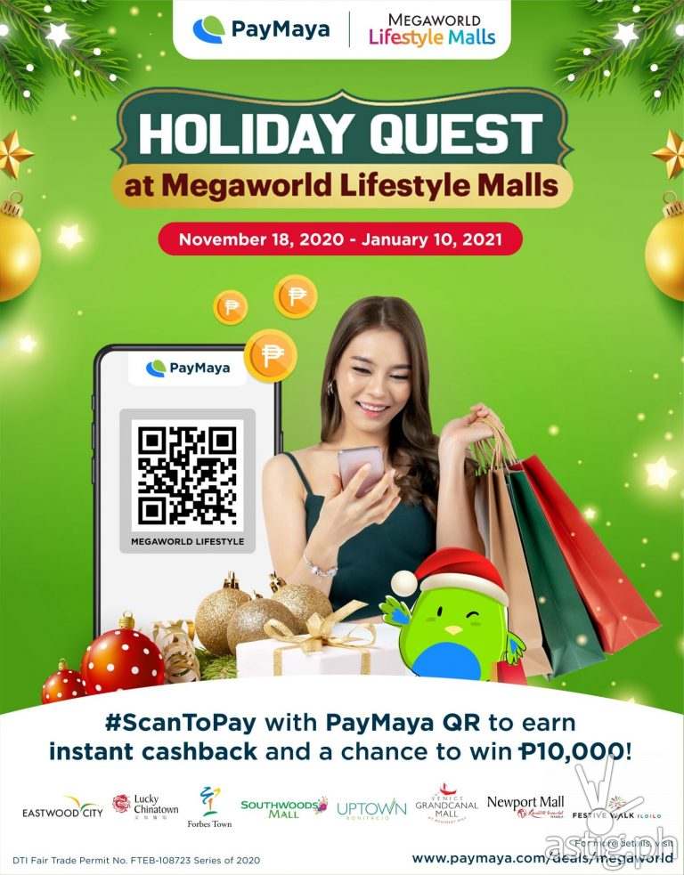 From November 18, 2020 until January 10, 2021, you can get a chance to win P10,000 when you #ScanToPay at least P500 via PayMaya QR in participating stores at Megaworld Lifestyle Malls including Eastwood City, Lucky Chinatown, Forbes Town, Southwoods Mall, Uptown Bonifacio, McKinley Hill, Newport Mall at Resorts World Manila, and Festival Walk Iloilo.