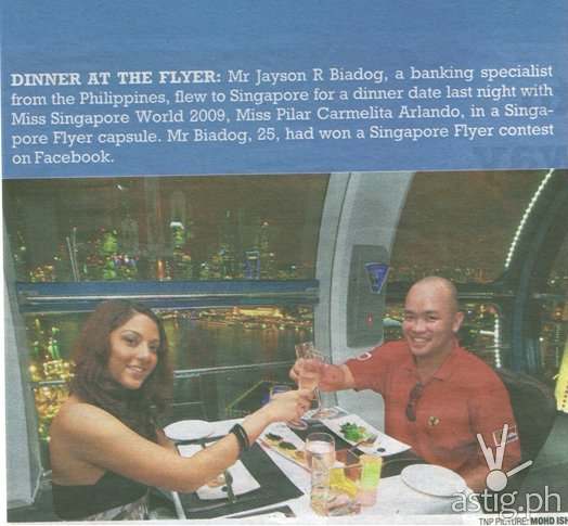 On top of Singapore Flyer I remember having a dinner with Ms World. Talking about football and how she like CR7 Cristiano Ronaldo a lot also David Beckham. So I insists Wayne Rooney on Manchester United who look like semi bald like me did great awesome overhead diving bicycle kick for the win. So the good rapport talks keeps going on and on, wine and gourmet were served, love songs were played as the flyer goes round and round.