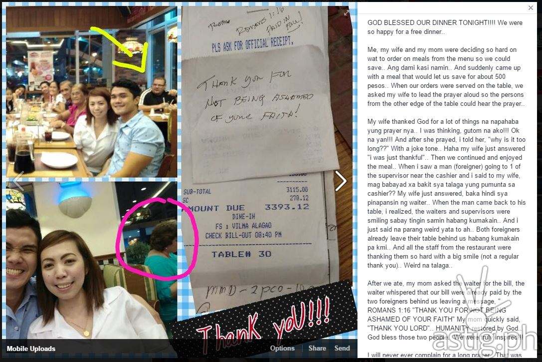 After we ate, my mom asked the waiter for the bill, the waiter whispered that our bill were already paid by the two foreigners behind us leaving a message, ” ROMANS 1:16 “THANK YOU FOR NOT BEING ASHAMED OF YOUR FAITH” My mom quickly said, “THANK YOU LORD”.. HUMANITY restored by God.. God bless those two people.. We were truly inspired!!!