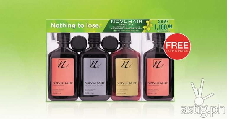 The NOVUHAIR® 3-in-1 promo pack contains one 200mL bottle each of the Topical Scalp Lotion, Herbal Shampoo, Herbal Condition plus another 200mL Herbal Shampoo worth ₱1,100 for FREE!