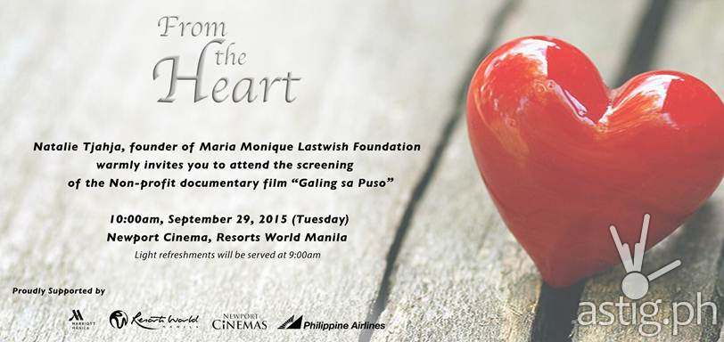Marriott Hotel Manila and Newport Cinemas is holding a free screening of From the Heart. Renamed Galing sa Puso for the Filipino audience, the film is a documentary about the inspiring journey of Natalie Tjahja, founder of the Maria Monique Lastwish Foundation. Galing sa Puso shares how Tjahja’s heartbreaking loss inspired her to set up a foundation dedicated to helping children with disabilities or terminal illnesses–in some cases, granting their last wishes.