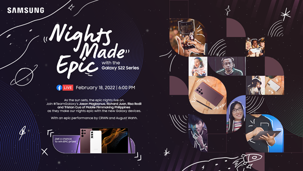 Tune in to the Samsung Facebook page at 6:00 PM on February 18 for Nights Made Epic and join the country’s top creators, including Mobile Filmmaking Philippines, wedding videographer Jason Magbanua, influencer and content creator Richard Juan, and illustrator Risa Rodil, as they showcase their epic content using the Galaxy S22 Series and Galaxy Tab S8 Series.