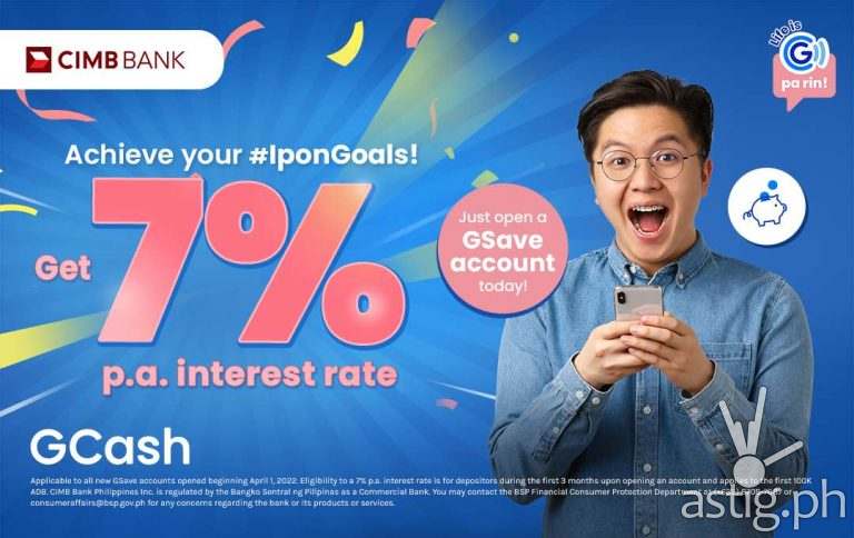 MANILA, Philippines – To help Filipinos grow their finances and achieve their #IponGoals, GCash, the leading mobile wallet in the country, and CIMB Bank, the country’s leading digital banking services provider, are offering as much as 7% per annum on GSave. Currently the highest interest rate available in the market, the offer is available to GCash users who will sign up for their first GSave account from April 1, 2022 to June 30, 2022.