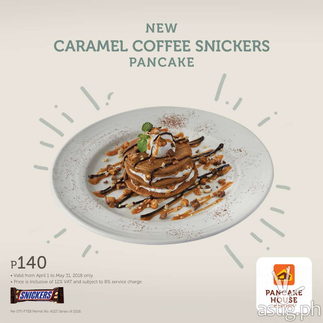 Can’t get enough of sweets this summer? Have a Snickers® and pancake combo with Pancake House’s new Caramel Coffee Snickers Pancake! For only P140, indulge in a tower of coffee-flavored pancakes sprinkled with chopped Snickers®, and made even more luscious with whipped cream, caramel, chocolate syrup,and cashews. Treat yourself to this new, delightful dish from Pancake House, available from April 1 to May 31, 2018 only.