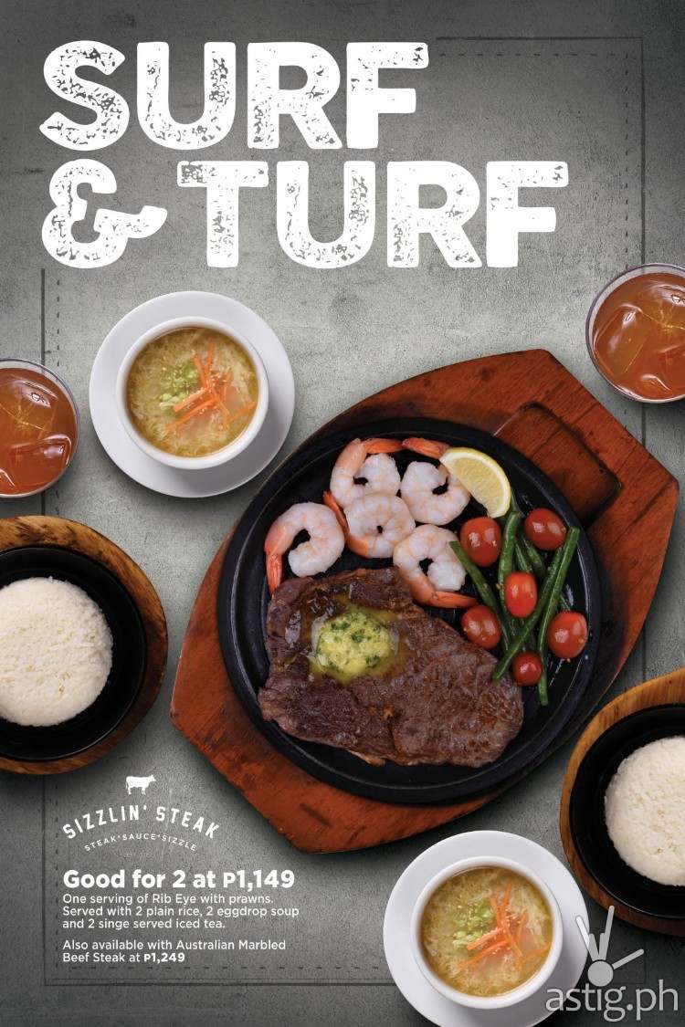 Bring on the sizzle! Upgrade your Surf & Turf Plate with an Australian Marbled Beef Steak for P697 (Solo) and P1,249 (good for 2).