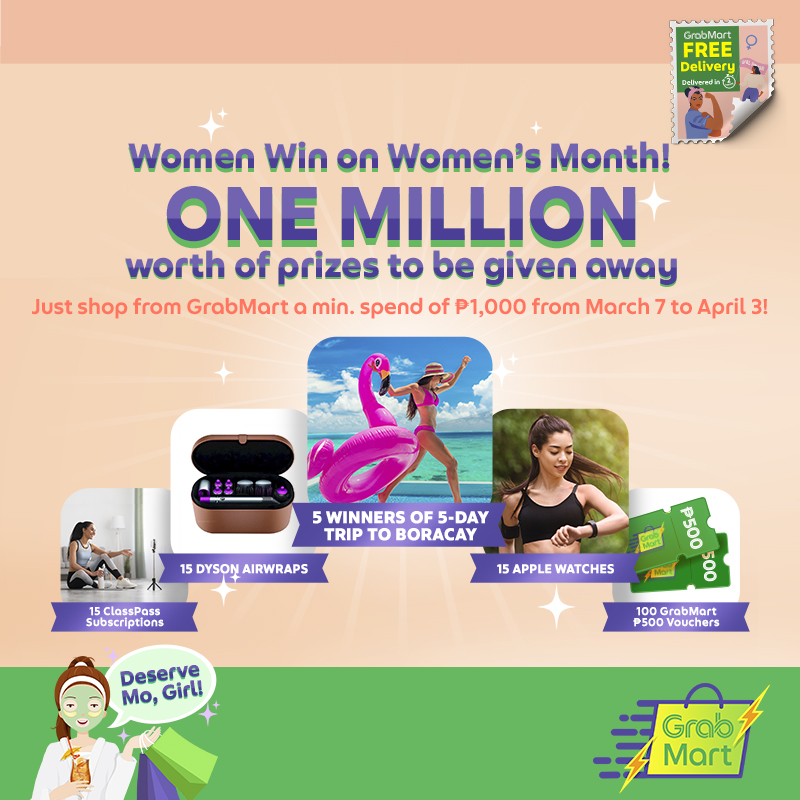 - No need for mall goers to miss out on the big sales they’ve grown to love and look forward to, because GrabMart also gives shoppers endless promos, discounts, and even a month-long raffle— making it even more fulfilling for women to grab the things they deserve. With just a minimum spend of Php 1,000 on GrabMart, shoppers will be entitled to one raffle entry for a chance to win a 5-day getaway trip to Boracay for two, a Dyson Airwrap, an Apple Watch Series 7 GPS, Fitness/Wellness/Beauty passes from ClassPass (up to 10 passes) or Php 500 of GrabMart Vouchers.