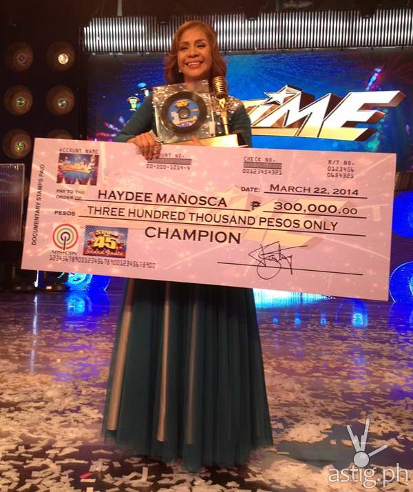 Forty five-year-old Haydee Manosca of Taguig City was declared the first-ever grand champion of “Stars on 45” for giving stirring and powerful renditions of two ballads last Saturday (Mar 22) during its grand finals on “It’s Showtime.”