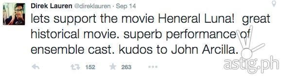 “Easily the most consummately done film we have seen this year. An impressive, compelling historical drama that, unlike others of this genre, looks history straight in the eye. HENERAL LUNA is a war epic that succeeds in putting an emotional and dramatic patina to a critical period of Philippine history. The film quickly catches fire and passionately unfolds, and then ends in a mesmerizing, dynamic climax. Excellent script, cinematography and performances. The main cast was brilliant—everyone was exceptional, with special mention going to John Arcilla who managed to bring Antonio Luna to life on the big screen. Director Jerrold Tarog masterfully and skillfully handled his material. The producers should be commended for making this significant film. This movie truly deserves an A.”