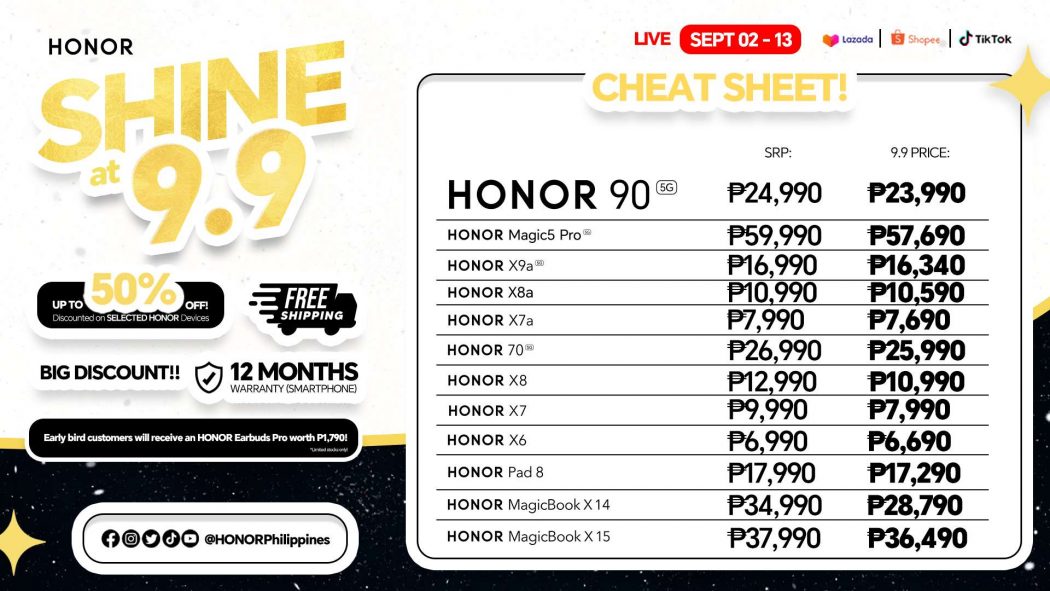 Treat yourself with your favorite HONOR Gadgets this 9.9 Sale. From the record-breaking HONOR 90 5G to the viral HONOR Magic5 Pro as well as HONOR X Series, you can get up to Php 2,300 off and a FREE HONOR Band 6 worth Php 1,790 when you shop on Shopee, Lazada, and TikTok from September 9 to 13, 2023!