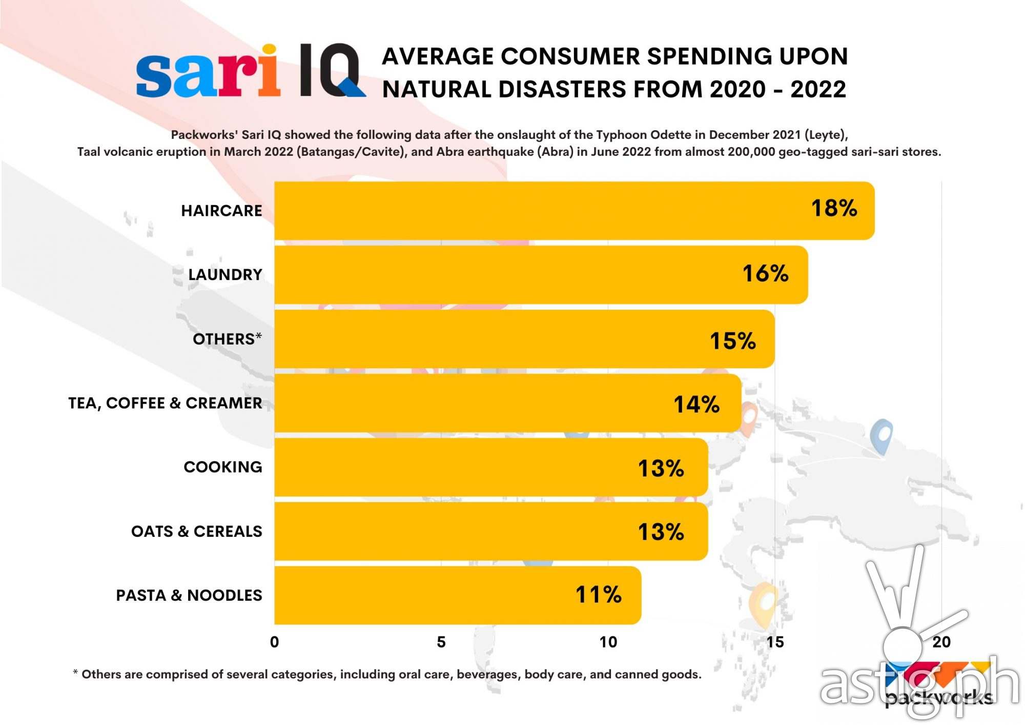 Data from Packworks Sari IQ showed that after the onslaught of the three aforementioned natural disasters, 18% of the average total sales volume of sari-sari stores were hair care products. Laundry supplies and tools saw the second highest portion of average sales with 16%, while breakfast items such as tea, coffee and creamer, and oats and cereals covered 14% and 13% of the total average sales, respectively.