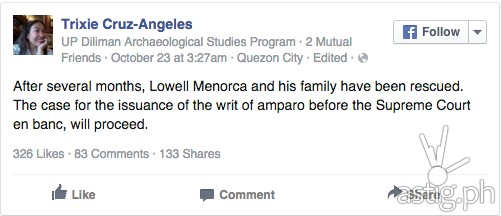 Lawyer Trixie Angeles posted on her Facebook page that Menorca and his family have been been finally rescued after seven months. Details on how they have been rescued was not still disclosed until now.