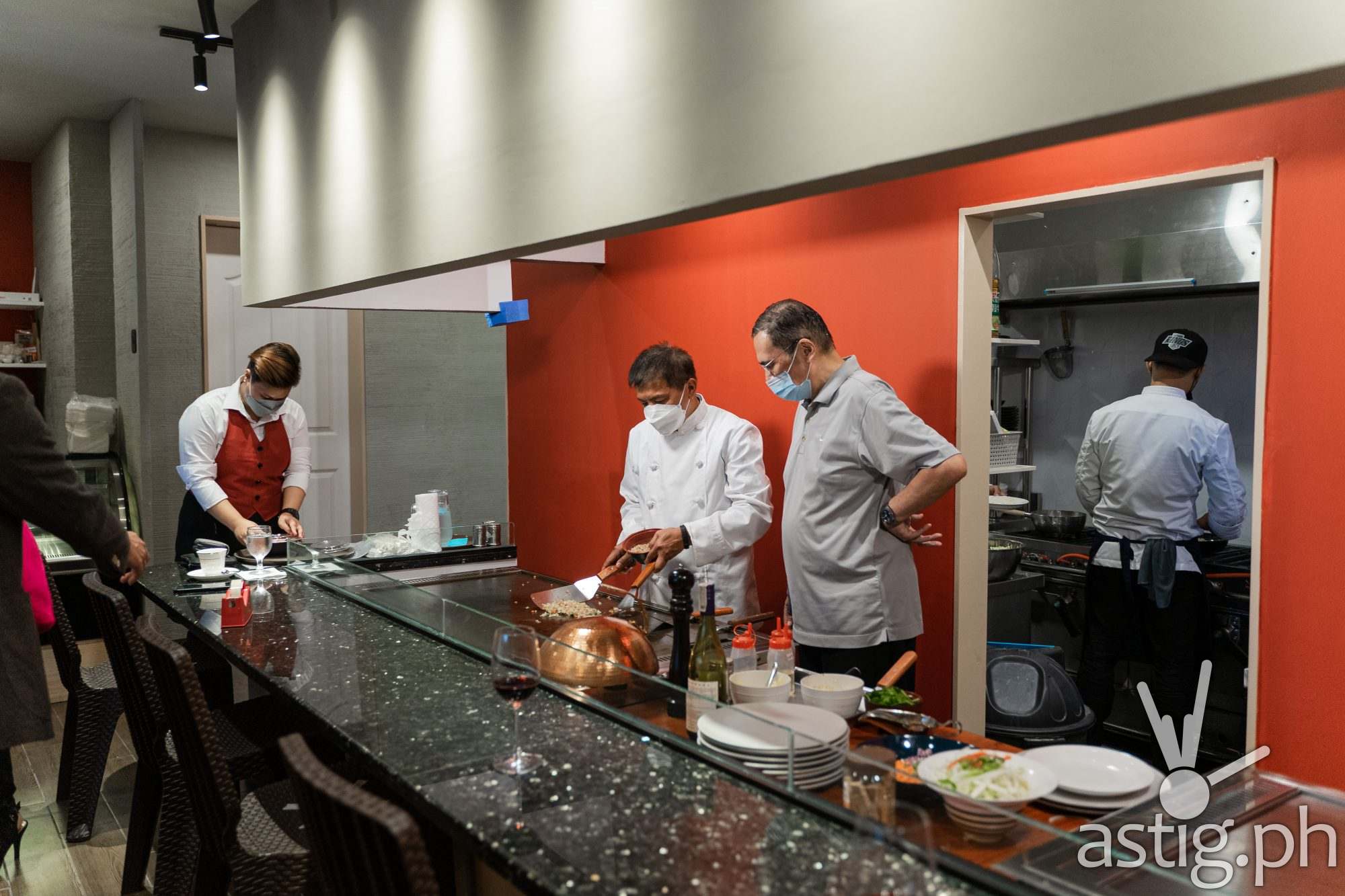 Upon entering the restaurant, one can readily appreciate its Japanese roots with its clean, cozy, and minimalist aesthetics. With its warm lighting, wood paneling accented by red highlights anchored by an open teppan grilling station, the space has a luxurious feel. There is also a well-stocked bar area with a wide assortment of wines, liquor, and spirits from all over the world.
