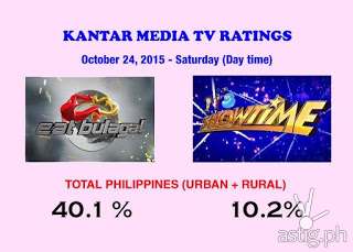 TV ratings show that It’s Showtime was left behind by Eat Bulaga having an estimated 30% difference in Kantar Media and 45% in AGB Nielsen. The ratings were recorded during Eat Bulaga’s Tamang Panahon episode where the show achieved historical 41 million tweets, 3 hour episode with no commercial breaks and 50,000 audience in Philippine Arena.